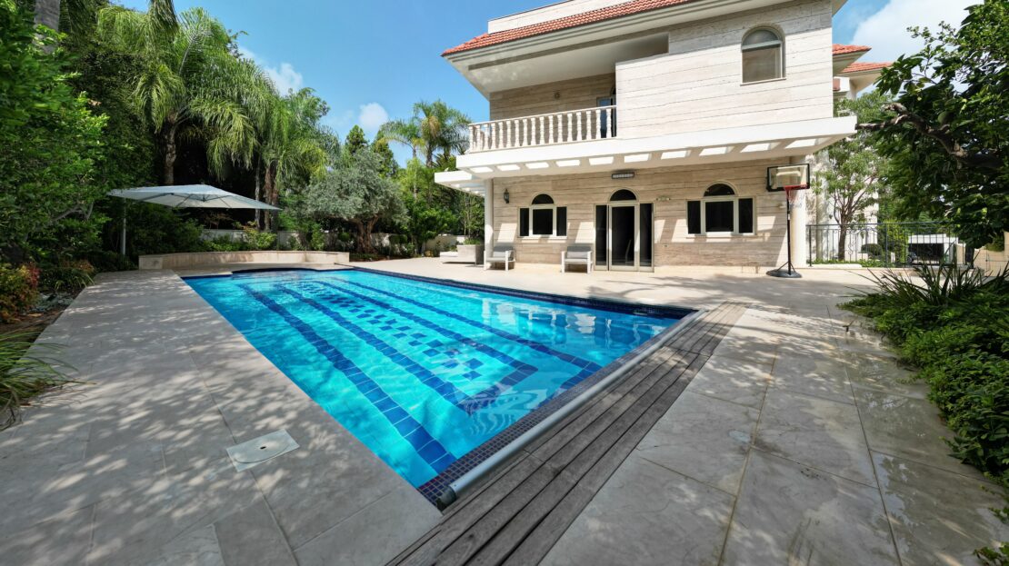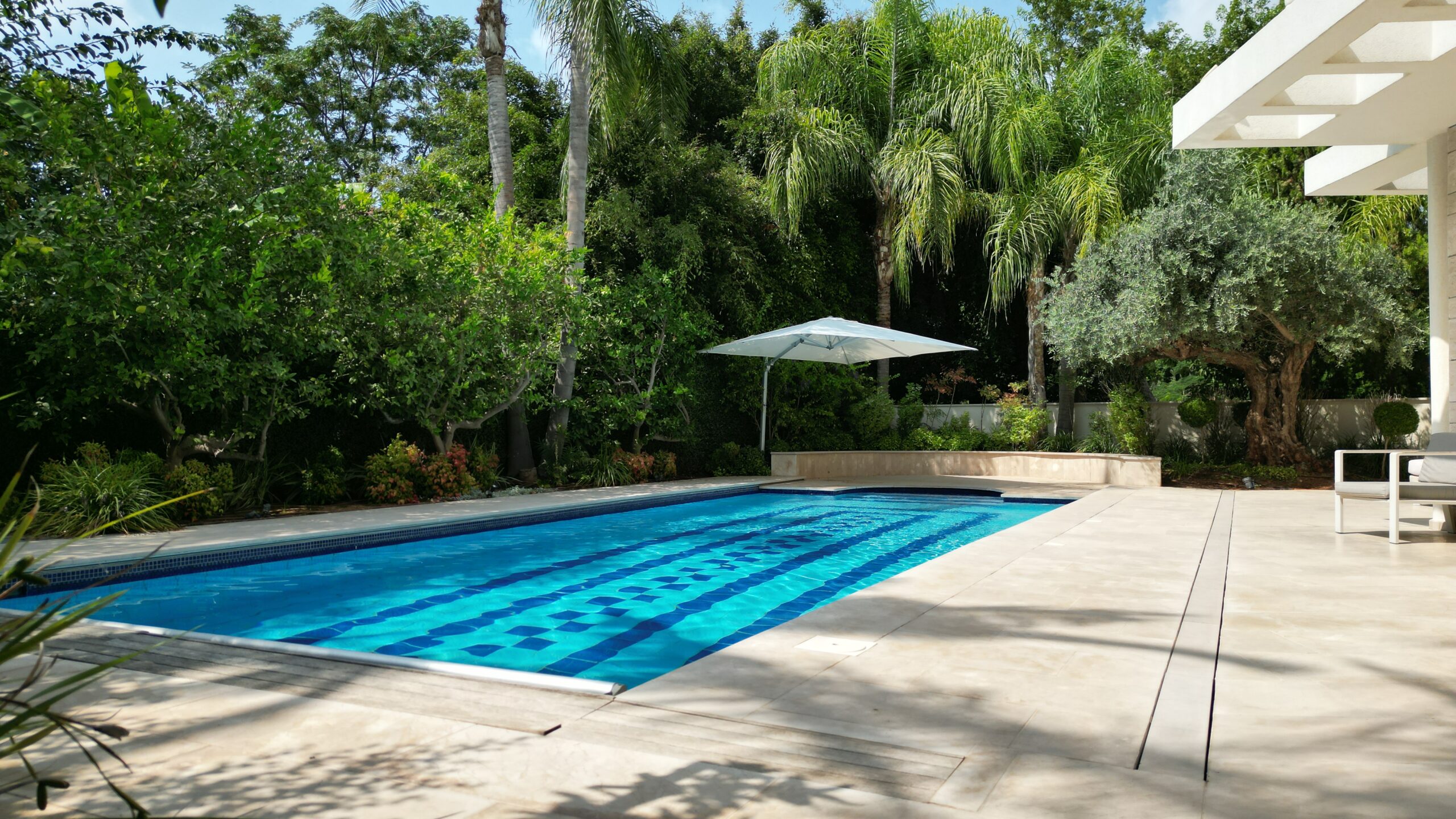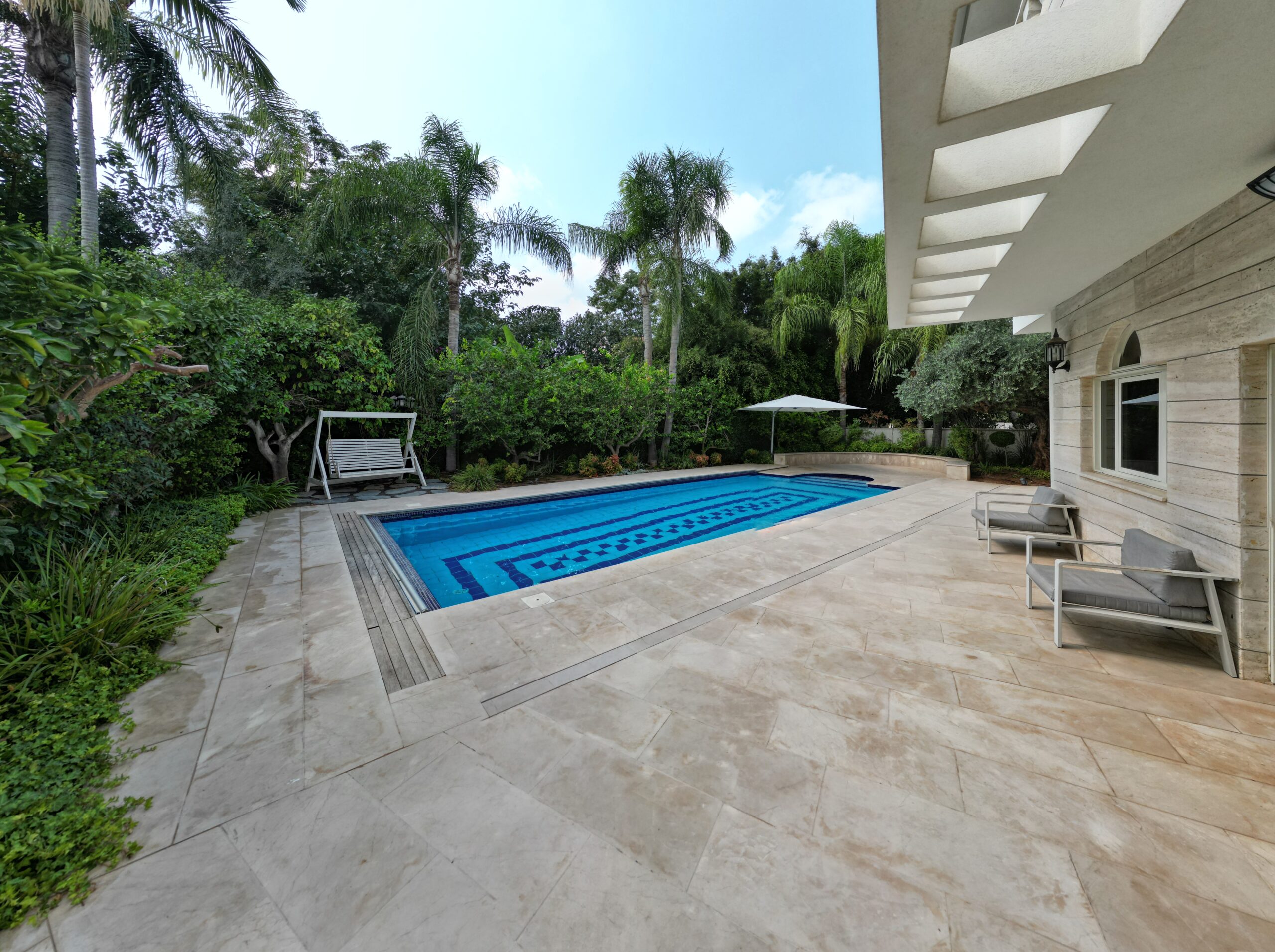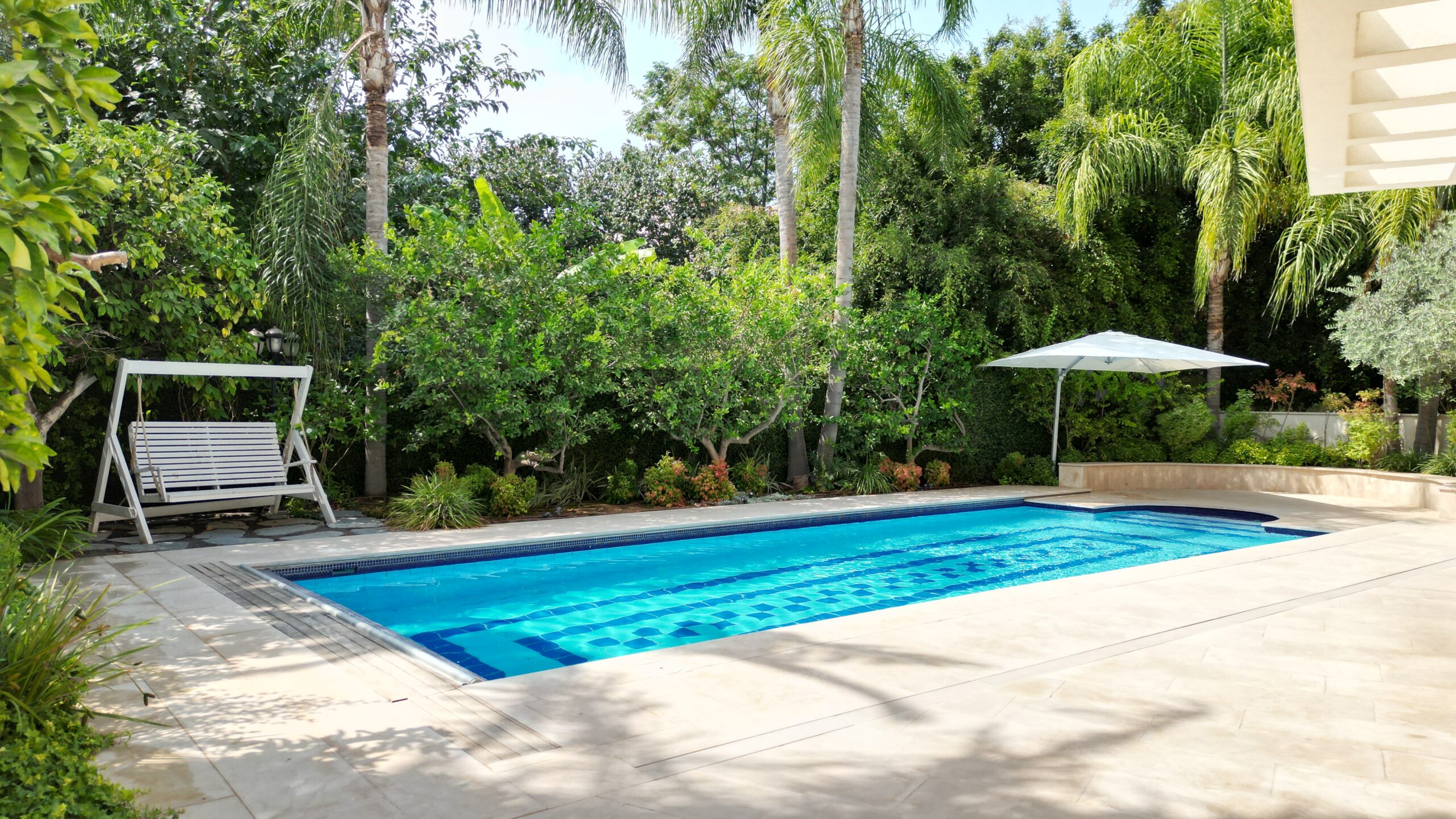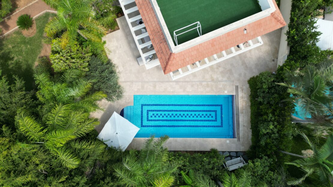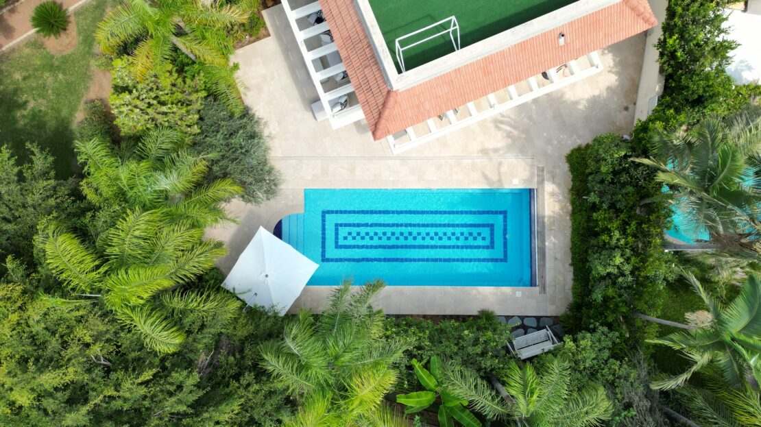 The master suite opens onto a private balcony with a breathtaking view of the pool, perfect for enjoying peaceful moments.