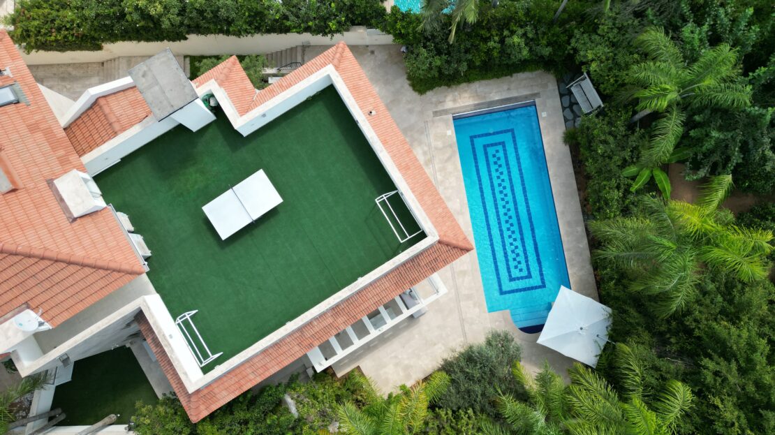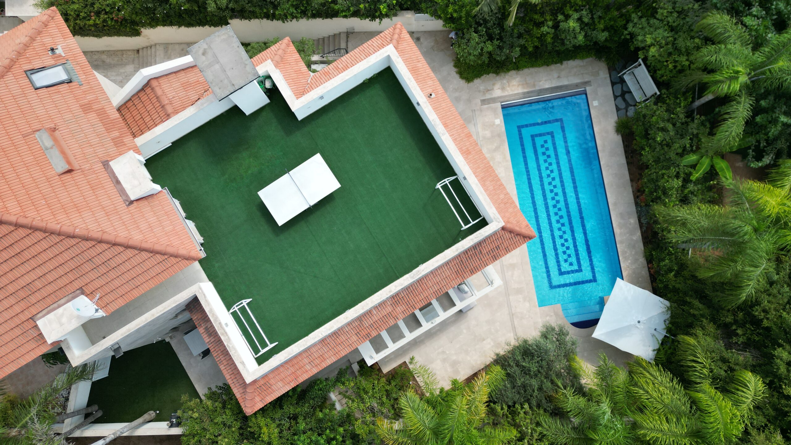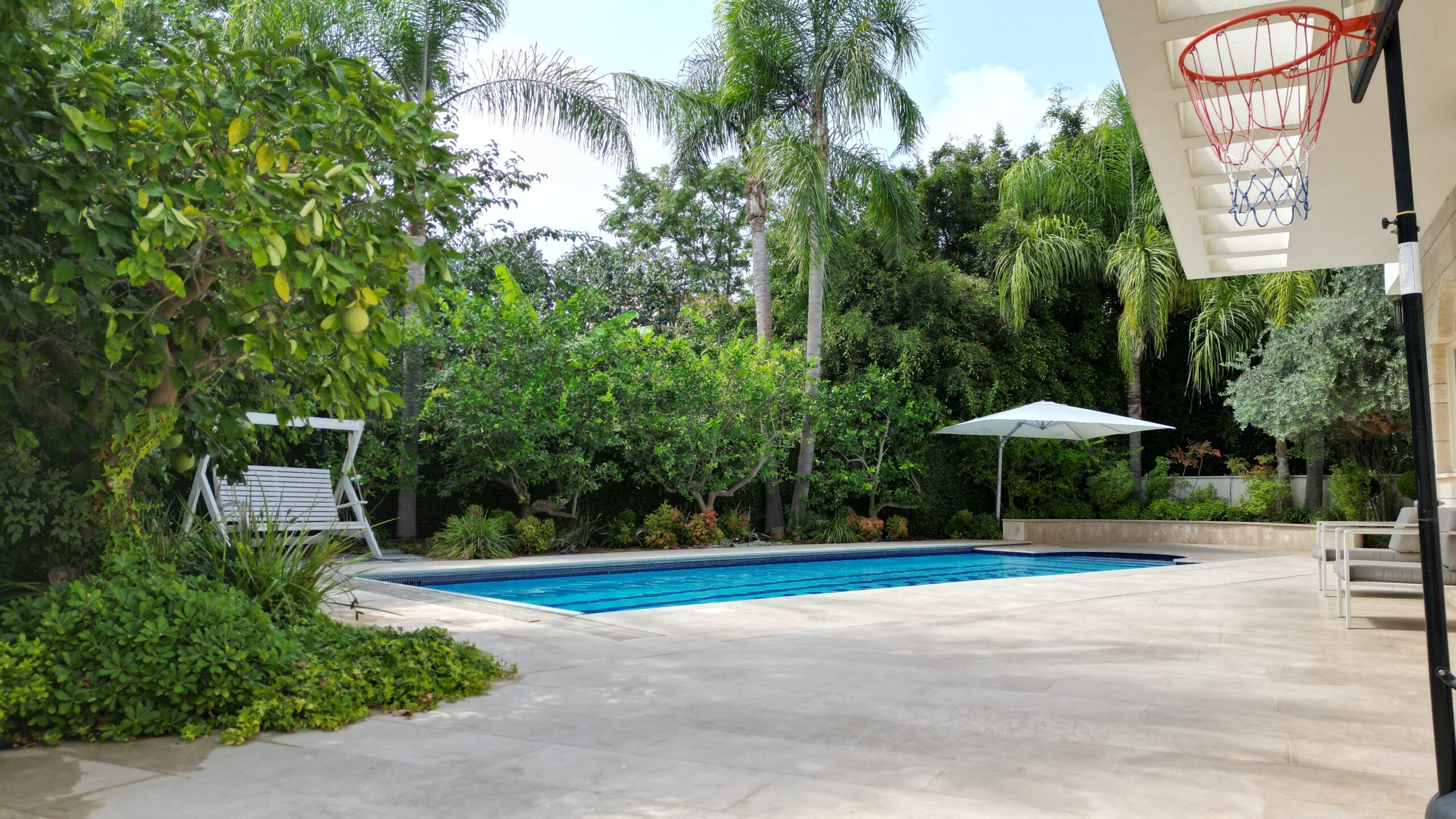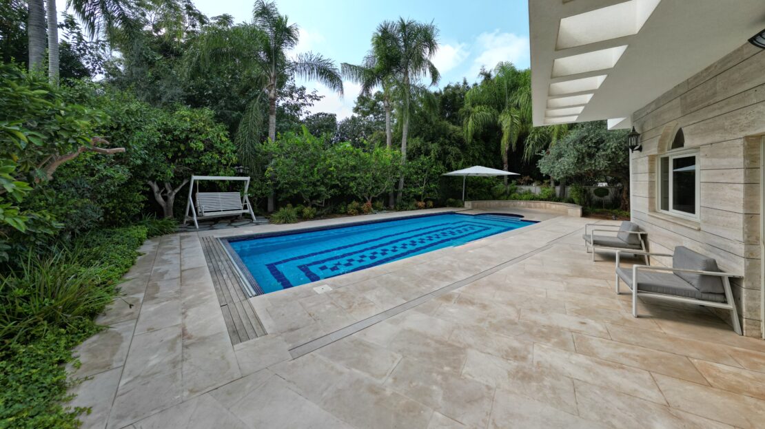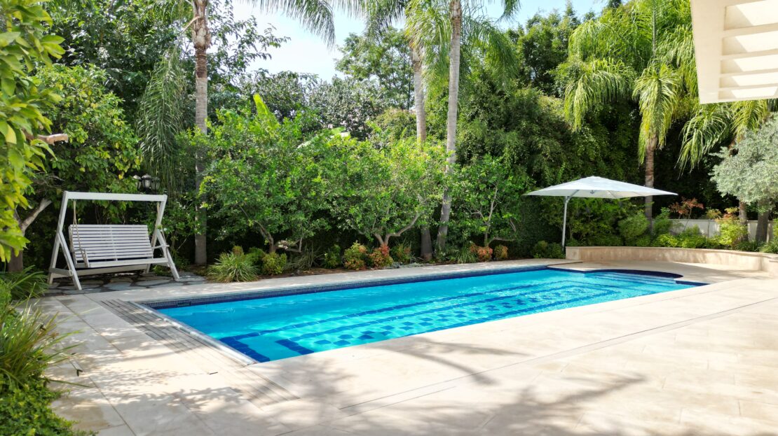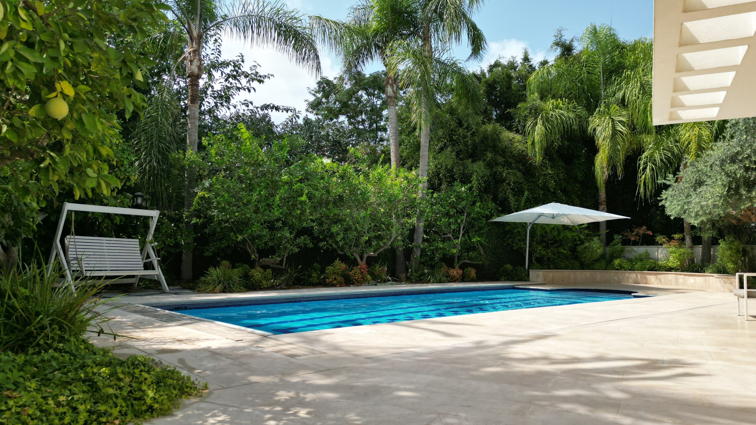 The master suite opens onto a private balcony with a breathtaking view of the pool, perfect for enjoying peaceful moments.